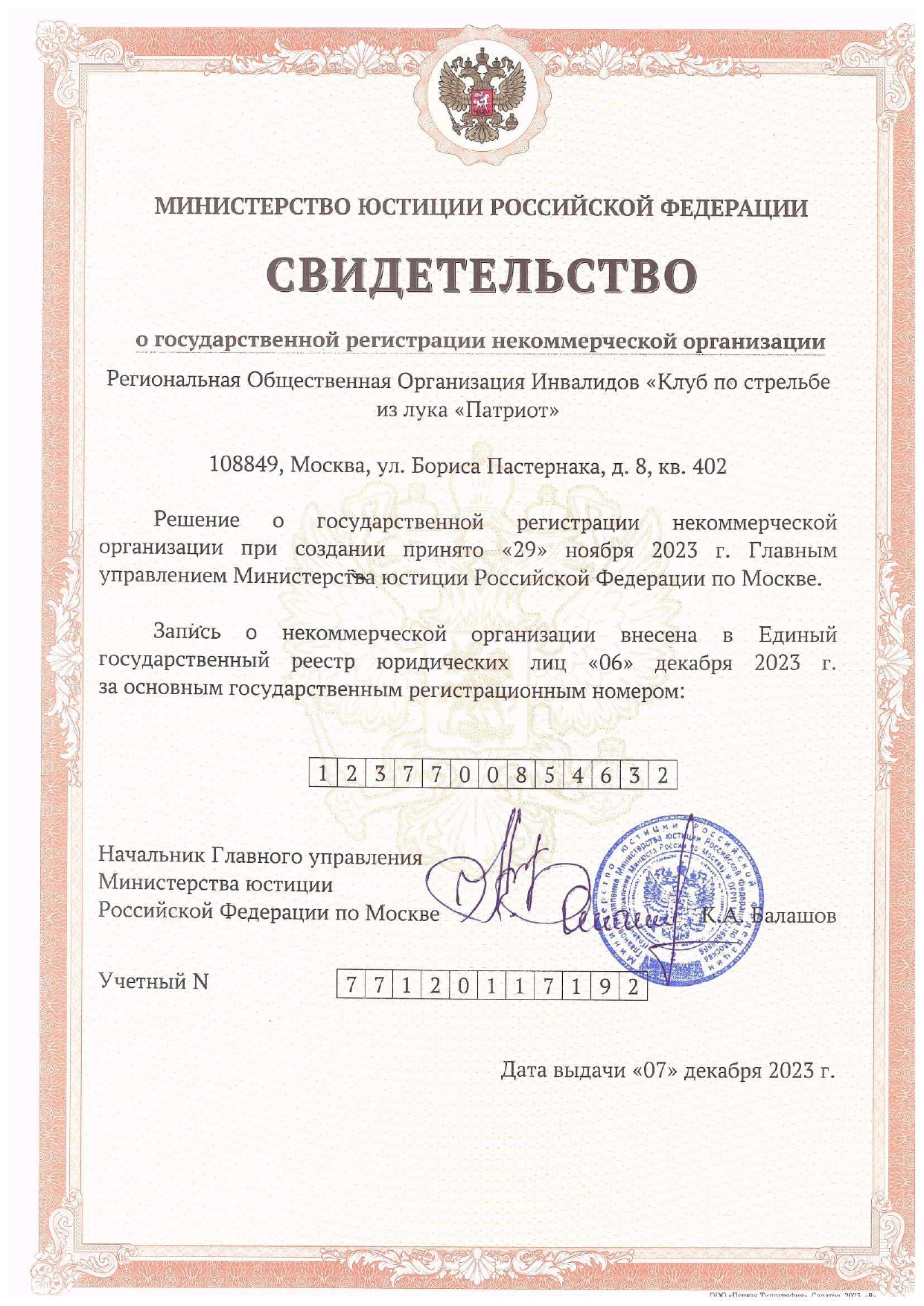 1.3. Полное наименование Организации на русском языке: Региональная Общественная Организация Инвалидов «Клуб по стрельбе из лука «Патриот».